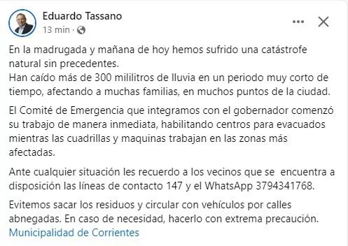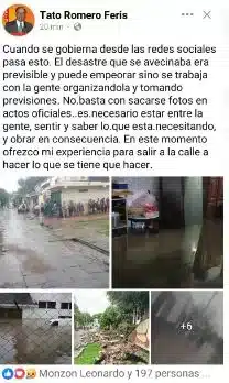TATO LE PEGÓ A TASSANO Y VALDÉS. Raúl Rolando «Tato» Romero Feris cargó desde redes sociales contra las gestiones de la Provincia y el Municipio por los inconvenientes hídricos que se iniciaron en la madrugada de ayer. Quien también tuvo apreciaciones críticas fue el diputado José Romero Brisco del Partido Autonomista (PA) que en redes sociales posteó: «Estuve recorriendo la ciudad ayudando a las personas que pude. ¿Por qué la Municipalidad no pone a disposición los miles de agentes que tiene?», inquirió.