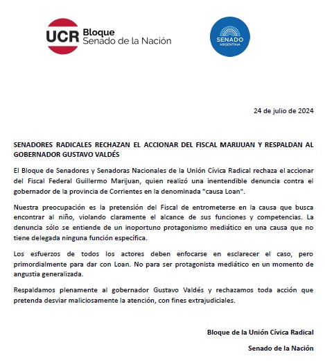 Tras la denuncia del fiscal federal Guillermo Marijuan al gobernador Gustavo Valdés por el presunto encubrimiento de la desaparición de Loan Danilo Peña, un bloque de senadores nacionales de la Unión Cívica Radical (UCR) manifestaron su rechazo.