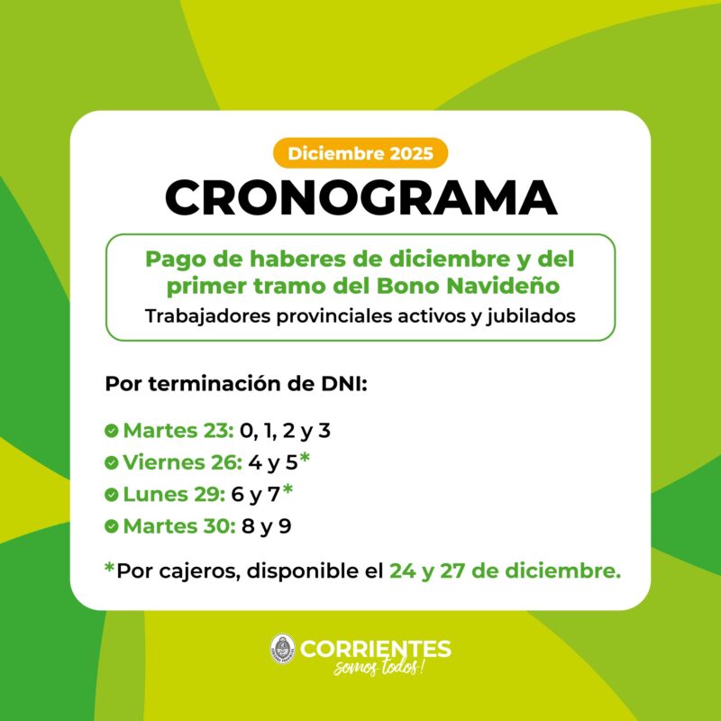 A través de las redes oficiales del Gobierno de Corrientes, se dio a conocer el cronograma de pago de haberes del mes diciembre y el primer tramo del Bono Navideño anunciado, para trabajadores provinciales activos y jubilados.