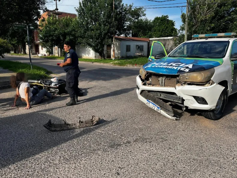 La esquina de Estado de Israel y República Dominicana, en pleno corazón del barrio Antártida Argentina, fue escenario este jueves de un siniestro vial. Alrededor de las 8.30 de la mañana, una motocicleta y un patrullero de la Policía de Corrientes colisionaron violentamente, dejando como saldo un joven herido de gravedad.