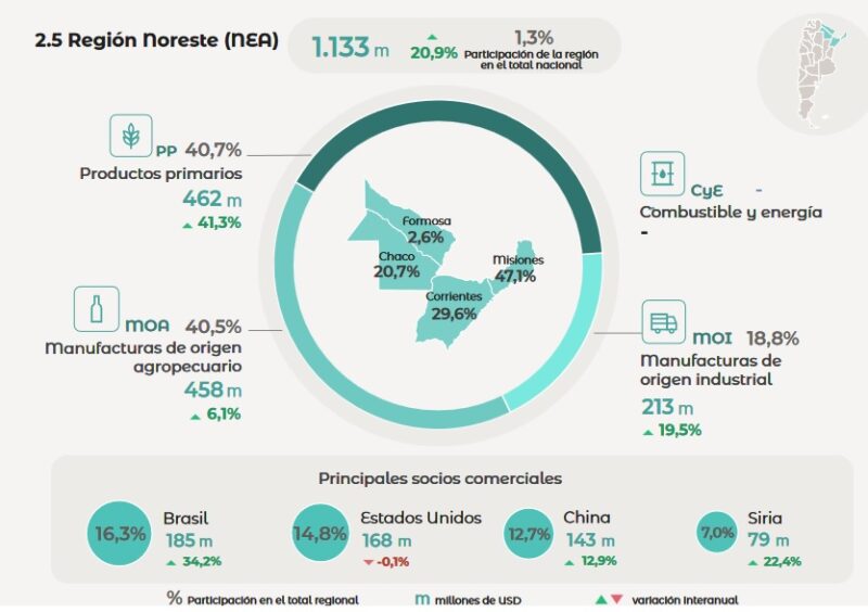 El Noreste Argentino (NEA) se posicionó como la región de mayor crecimiento en el país, con una suba del 20,9 por ciento, superando incluso a la Patagonia y al NOA. Dentro de este bloque, si bien Misiones lidera en volumen total (533 millones de dólares), Corrientes se consolida como el segundo motor regional, representando casi el 30 por ciento de las exportaciones del NEA.