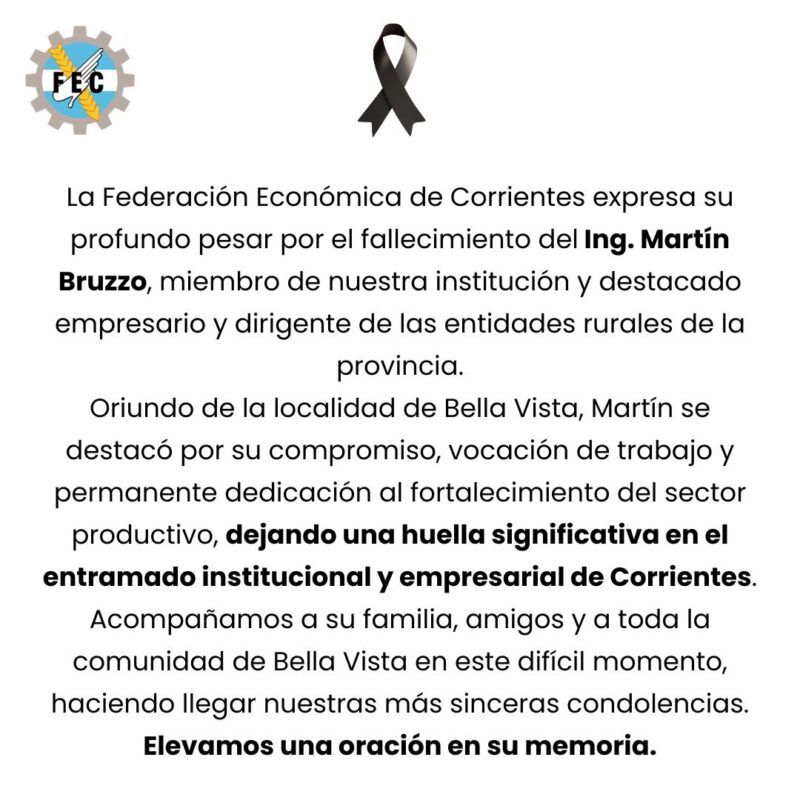 “Oriundo de la localidad de Bella Vista, Martín se destacó por su compromiso, vocación de trabajo y permanente dedicación al fortalecimiento del sector productivo, dejando una huella significativa en el entramado institucional y empresarial de Corrientes”, expresaron desde la entidad, haciendo llegar sus condolencias a familiares y amigos del empresario fallecido.
