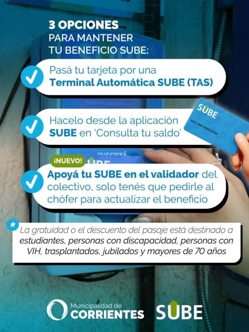 El municipio capitalino, a través de la Subsecretaría de Transporte, recuerda que los usuarios que viajan en transporte público con tarjeta física Sube y cuentan con descuentos locales, deben actualizar el plástico para que esos beneficios se apliquen correctamente a la hora de viajar. Si bien ya se podía realizar este trámite simple desde una de las Terminales Automáticas Sube(TAS) o en la app Sube, ahora se le suma la posibilidad de actualizar en el validador de un colectivo con Atributo a Bordo, sólo apoyando la tarjeta.