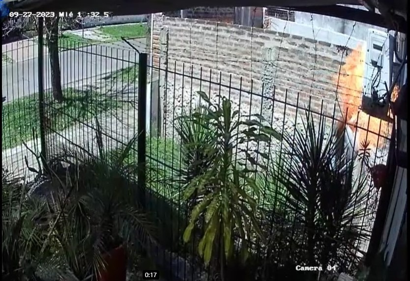 El “pirómano” llegó en motocicleta con otro hombre que lo esperó para huir, mientras él con el rostro cubierto por un barbijo, se acercó a las rejas de la vivienda, roció con combustible la unidad exterior del aire acondicionado split y con un encendedor lo prendió fuego.