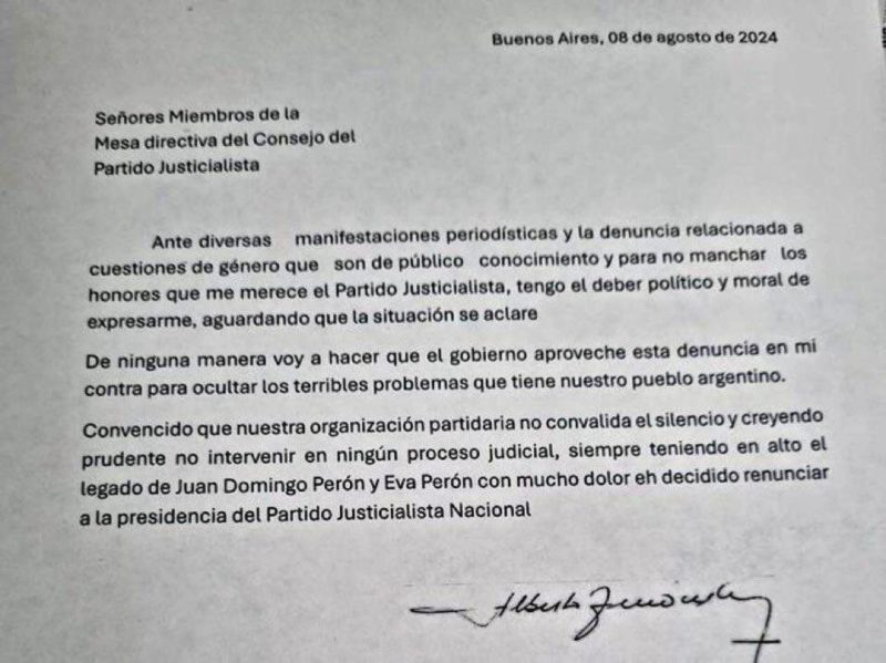 “Siempre teniendo en alto el legado de Juan Domingo Perón y Eva Perón, con mucho dolor he decidido renunciar a la Presidencia del Partido Justicialista Nacional”, cerró la misiva.