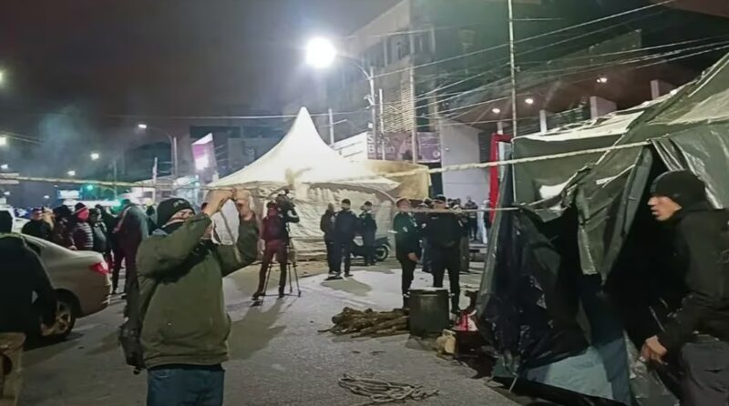En ese trayecto, se escucha claramente una detonación. Los manifestantes dijeron al regresar al acampe que fue un cohete de los que habitualmente arrojan. Fuentes del Gobierno aseguran que se trató de un disparo que intentó amedrentar a las autoridades. Amarilla tuvo que intervenir para convencer al grupo que salió anoche desde el acampe hasta el centro de no intentar un ingreso violento a la Jefatura.