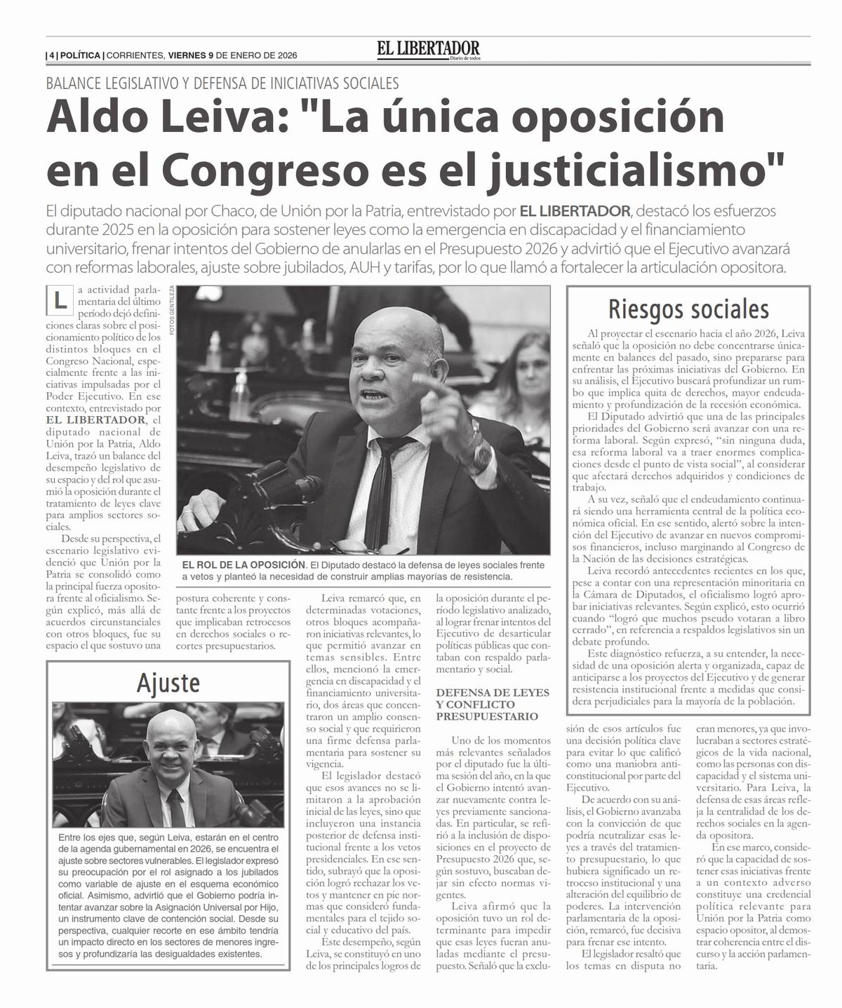 La actividad parlamentaria del último período dejó definiciones claras sobre el posicionamiento político de los distintos bloques en el Congreso Nacional, especialmente frente a las iniciativas impulsadas por el Poder Ejecutivo. En ese contexto, entrevistado por EL LIBERTADOR, el diputado nacional de Unión por la Patria, Aldo Leiva, trazó un balance del desempeño legislativo de su espacio y del rol que asumió la oposición durante el tratamiento de leyes clave para amplios sectores sociales.