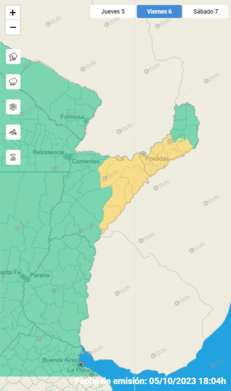 Por otro lado, el SMN informó que durante el sábado la mayor parte del Norte y Este de la provincia se encuentra en alerta amarilla por lluvias y tormentas.