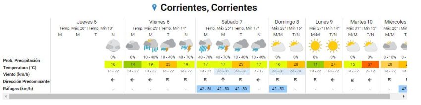 Por otro lado, para la ciudad de Corrientes hay pronóstico de chaparrones y tormentas aisladas, en un 10 a 40 por ciento, con temperaturas que rondarían entre los 14 y 25 grados.