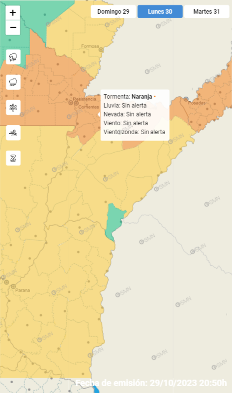 El Norte de la provincia se encuentra en alerta naranja, y según el Servicio Meteorológico Nacional se espera que la zona se vea afectada por tormenta de intensidad fuerte. Además, indicaron que las mismas pueden ser acompañadas por “caída de granizo, ráfagas intensas, fuerte actividad eléctrica y principalmente abundante caída de agua en cortos períodos”.