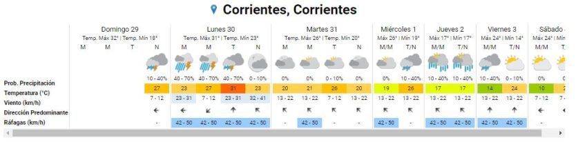 Para Corrientes, el pronóstico indica 70 por ciento de probabilidades de lluvias para la madrugada, mañana y mediodía. Además, se estima actividad eléctrica y ráfagas de hasta 50 km por hora.