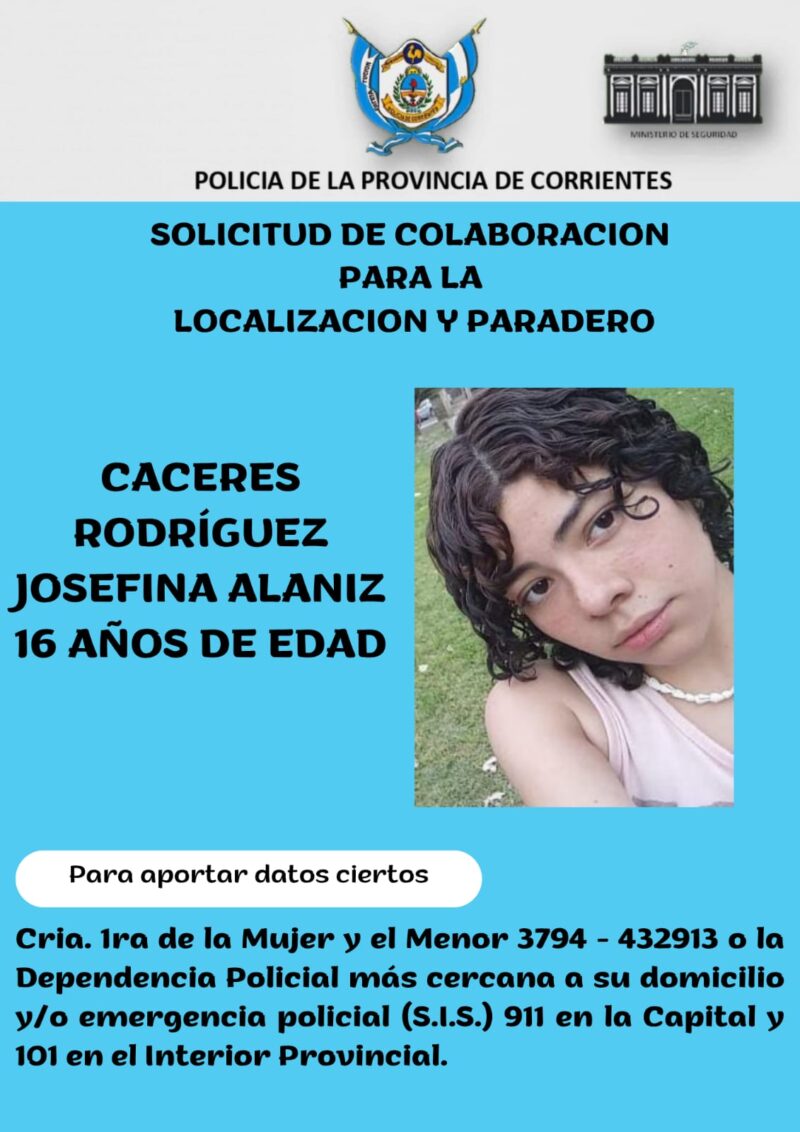 La Comisaría Primera de la Mujer y el Menor ha emitido una solicitud urgente de colaboración ciudadana para dar con el paradero de la adolescente Josefina Alaniz Caceres Rodríguez, de 16 años, quien se encuentra desaparecida desde hoy.