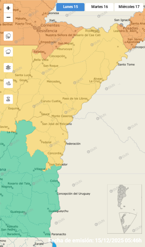 El área estará bajo efectos de tormentas de variada intensidad, algunas de estas serán localmente fuertes. Se espera frecuente actividad eléctrica y podría registrarse granizo de forma ocasional. Las ráfagas de viento alcanzarán hasta 70 km/h. Se prevé abundante caída de agua en cortos períodos, la precipitación acumulada estimada se ubica entre 30 y 70 mm. Este valor puede ser superado puntualmente.