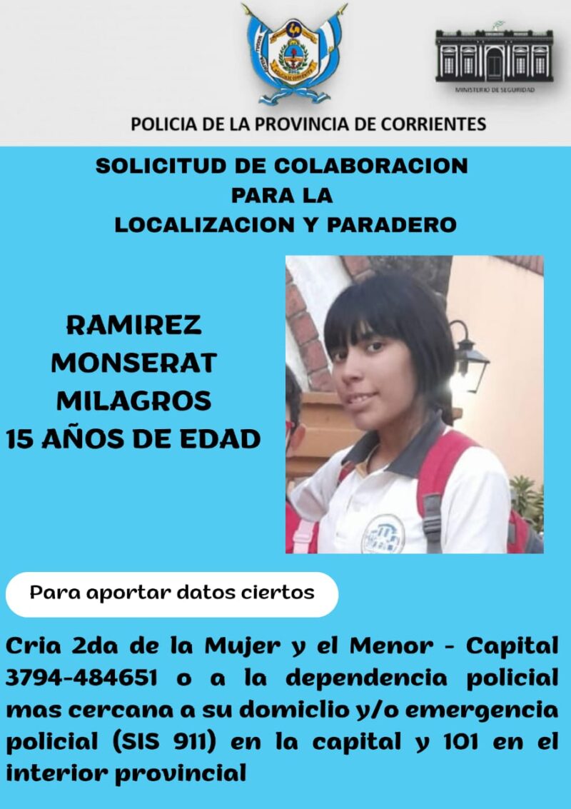 La Policía de Corrientes emitió una solicitud de colaboración urgente a la población para localizar a la menor Monserrat Milagros Ramírez, de 15 años de edad, quien falta de su domicilio desde ayer viernes 19 de diciembre. La denuncia fue radicada por una persona de apellido Aguirre ante la Comisaría Segunda de la Mujer y el Menor.