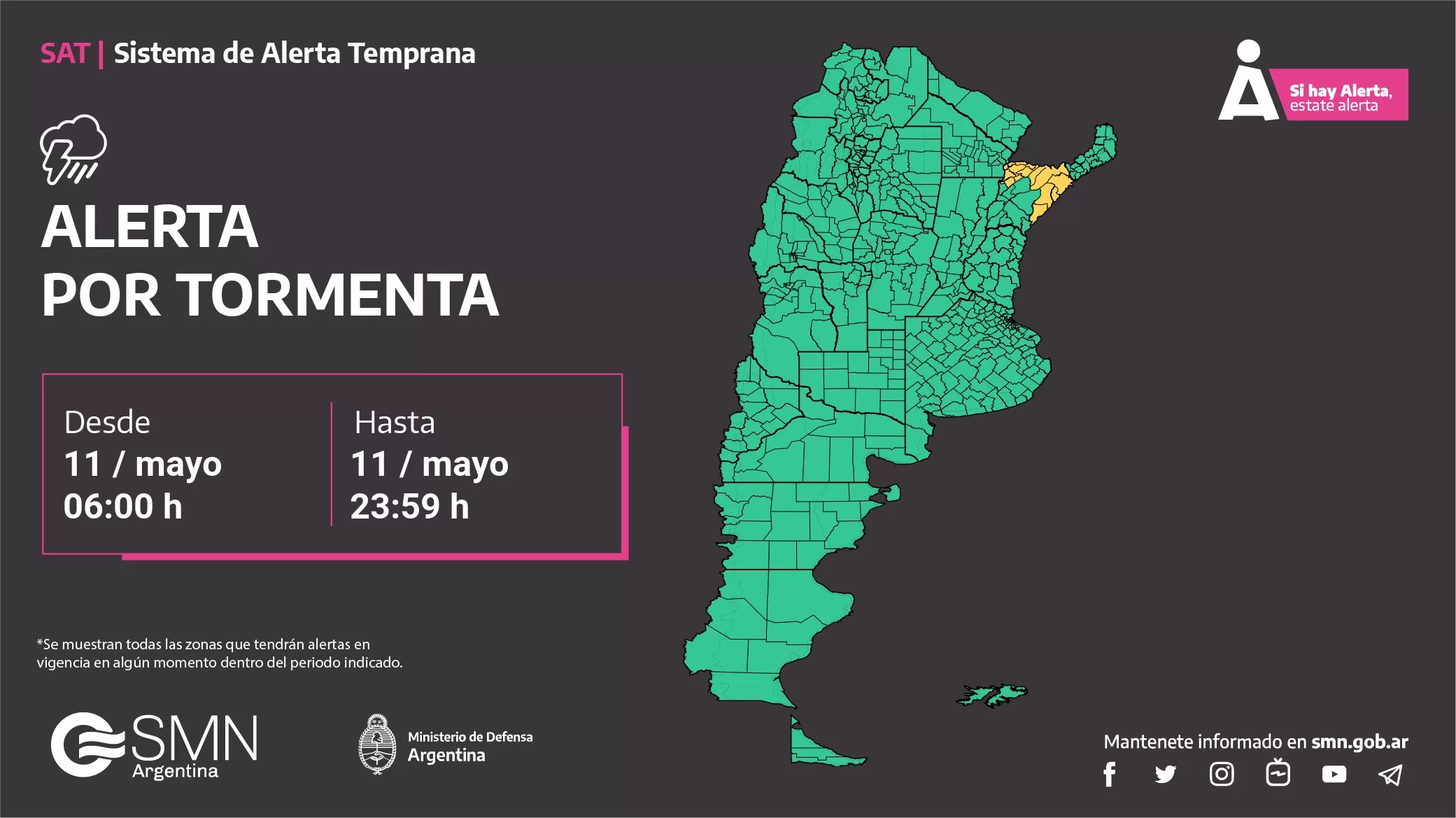 El Servicio Meteorológico Nacional (SMN), emitió un alerta amarillo por tormentas para el noreste provincial, que se extenderá durante este fin de semana. Se esperan lluvias y tormentas fuertes, por lo que si van a salir, no olviden el piloto y paraguas y un abrigo debido a que la temperatura no superará los 20 grados.