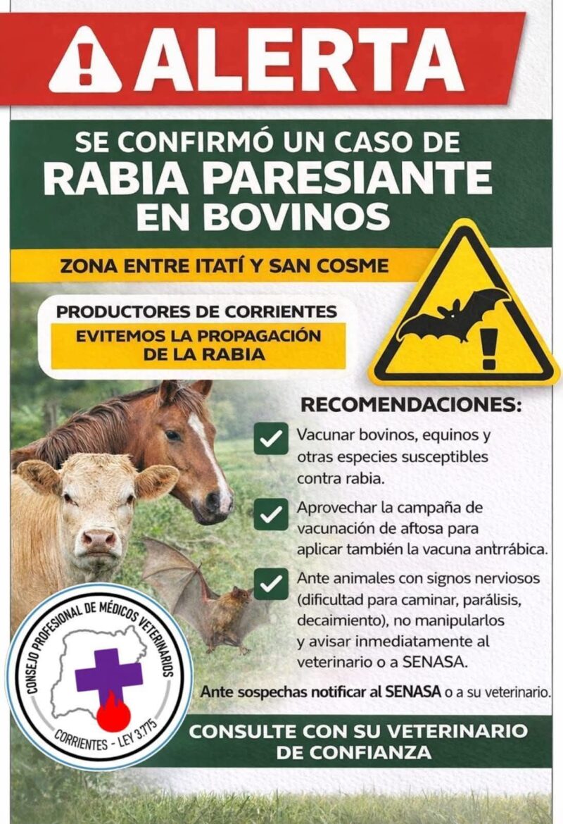 Según el comunicado difundido por la entidad, el caso fue detectado en una zona rural comprendida entre los departamentos de Itatí, San Cosme y Berón de Astrada, lo que motivó la emisión de una alerta dirigida a productores ganaderos y profesionales veterinarios.