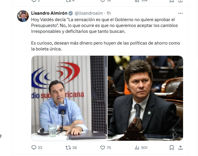 Lo hizo a través de un posteo en la red social X. “Hoy Valdés decía: ‘La sensación es que el Gobierno no quiere aprobar el Presupuesto’. No, lo que ocurre es que no queremos aceptar los cambios irresponsables y deficitarios que tanto buscan”, sentenció el legislador.