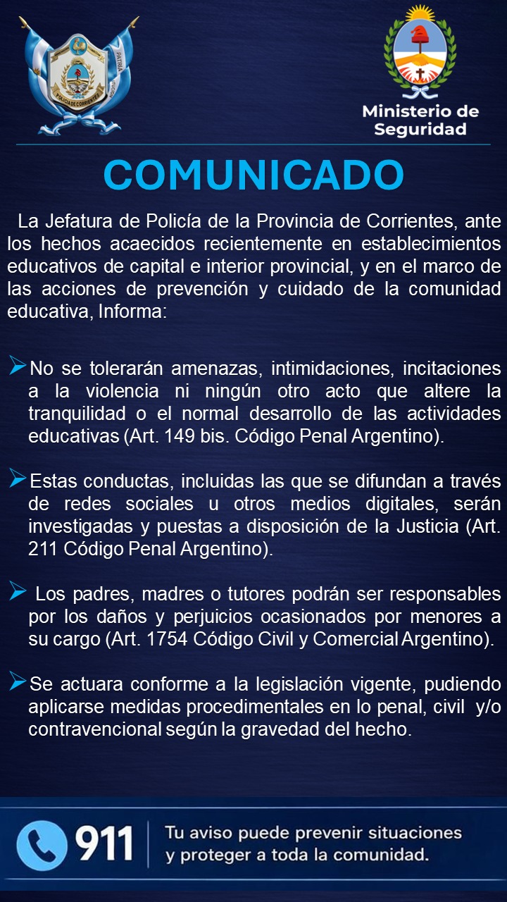 En una movida que busca frenar la escalada de psicosis y desorden en el ámbito escolar, la Jefatura de Policía de la Provincia de Corrientes, con el respaldo del Ministerio de Seguridad, emitió un comunicado tajante dirigido a toda la comunidad.
