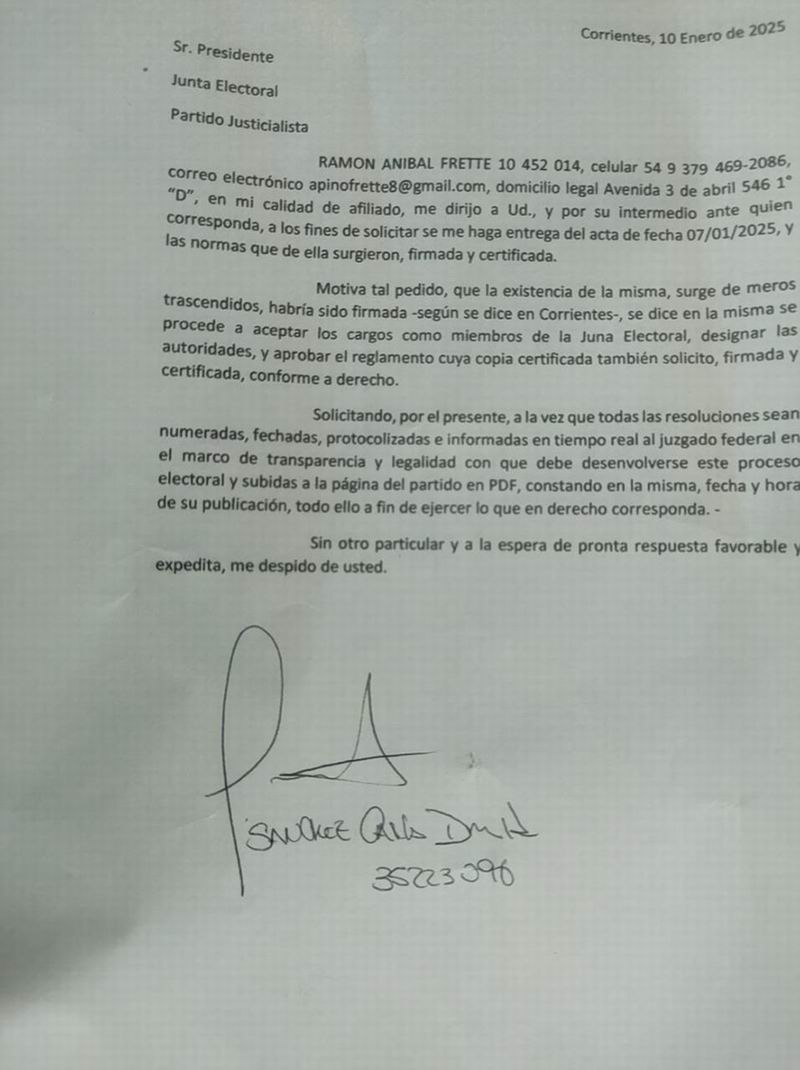 Frette también exigió que las resoluciones sean «numeradas, fechadas, protocolizadas e informadas en tiempo real al Juzgado Federal en el marco de transparencia y legalidad con que debe desenvolverse este proceso electoral y subidas a la página del partido en PDF, constando en la misma fecha y hora de su publicación».