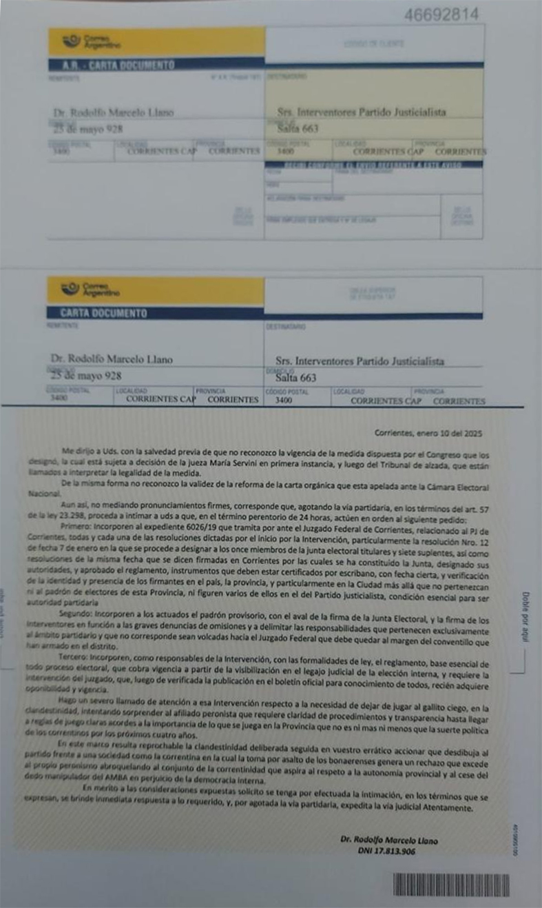 Llano también cuestionó la legalidad de la medida adoptada por el Congreso que designó a la Junta Electoral, recordando: «Me dirijo a ustedes, con la salvedad previa de que no reconozco la vigencia de la medida dispuesta por el Congreso que los designó, la cual está sujeta a decisión de la jueza María Servini en primera instancia, y luego del Tribunal de Alzada, que están llamados a interpretar la legalidad de la medida».