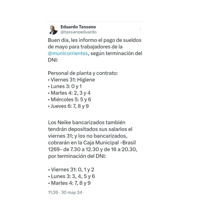 En tanto, el titular del Ejecutivo municipal también detalló que los agentes Neike bancarizados tendrán depositados los salarios en sus respectivas cuentas bancarias este mismo viernes 31 de mayo, dinero al que podrán acceder extrayéndolo a través de los cajeros automáticos habilitados.