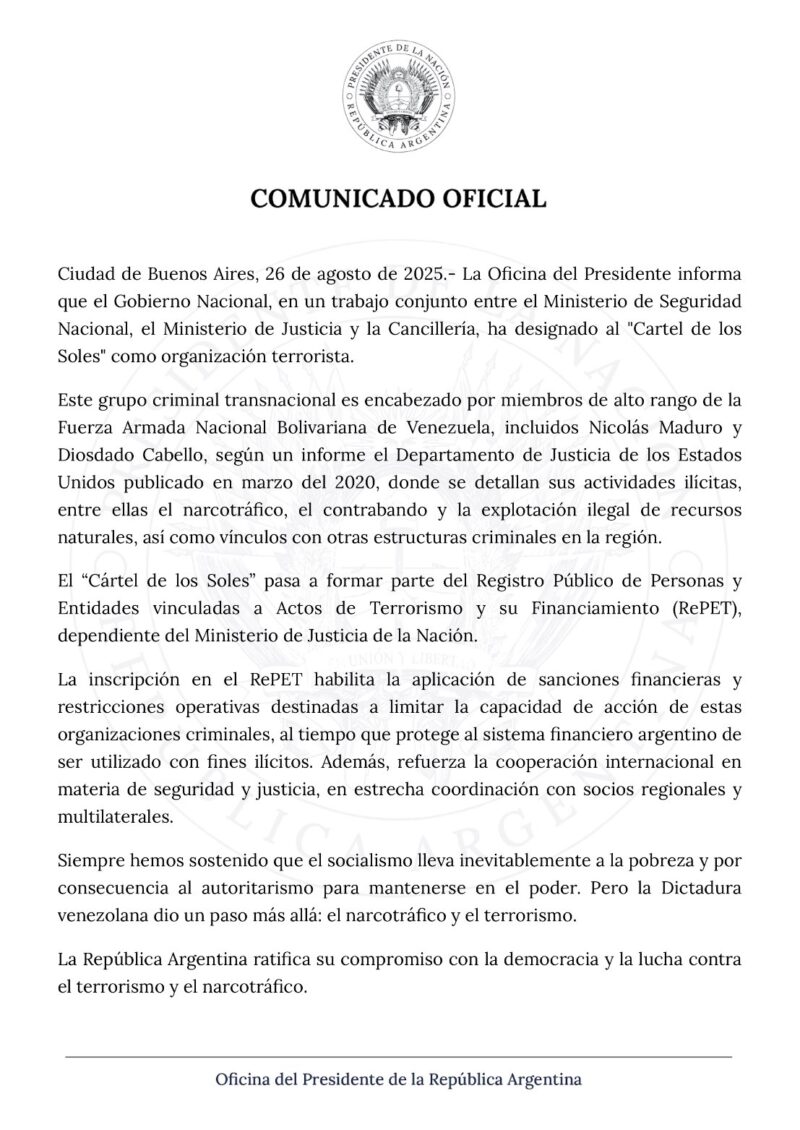 El Gobierno argentino declaró oficialmente al «Cártel de los Soles» como organización terrorista, incorporándolo al Registro Público de Personas y Entidades vinculadas a Actos de Terrorismo y su Financiamiento (RePET). Esta decisión, impulsada por la administración de Javier Milei, apunta directamente al grupo narcocriminal que, según acusaciones, lideran los venezolanos Nicolás Maduro y Diosdado Cabello.