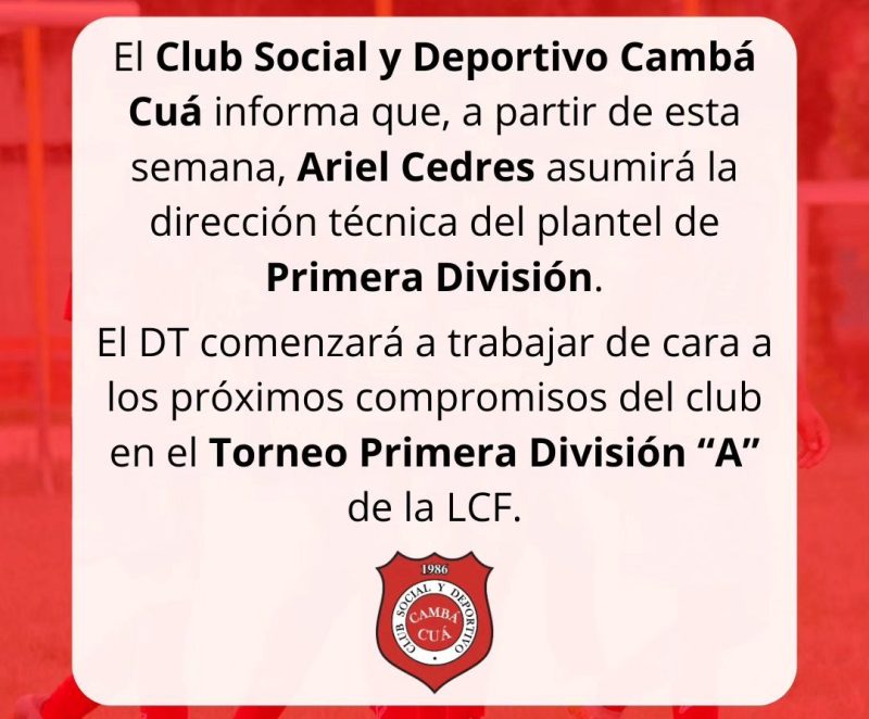 El club Cambá Cuá confirmó la llegada como director técnico del plantel de primera división de Ariel Cedres. La entidad «candombera» anunció en sus redes sociales que el director técnico estará asumiendo la conducción del plantel superior en el transcurso de la semana.