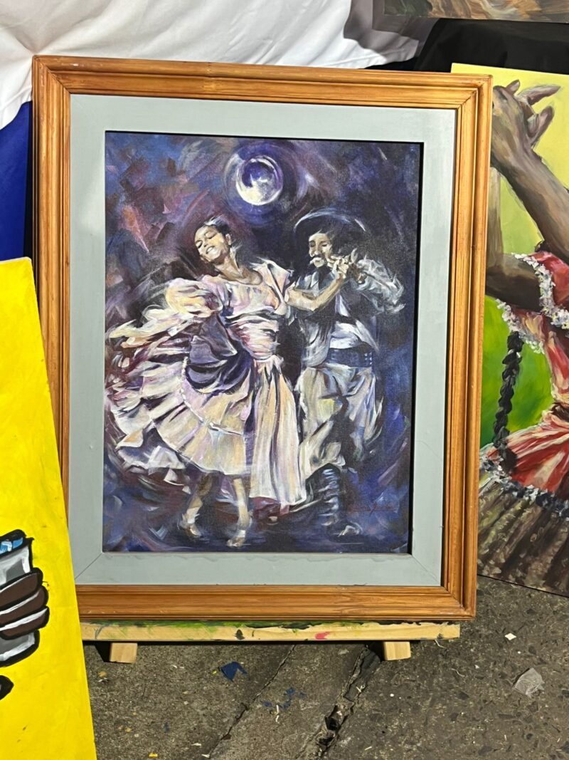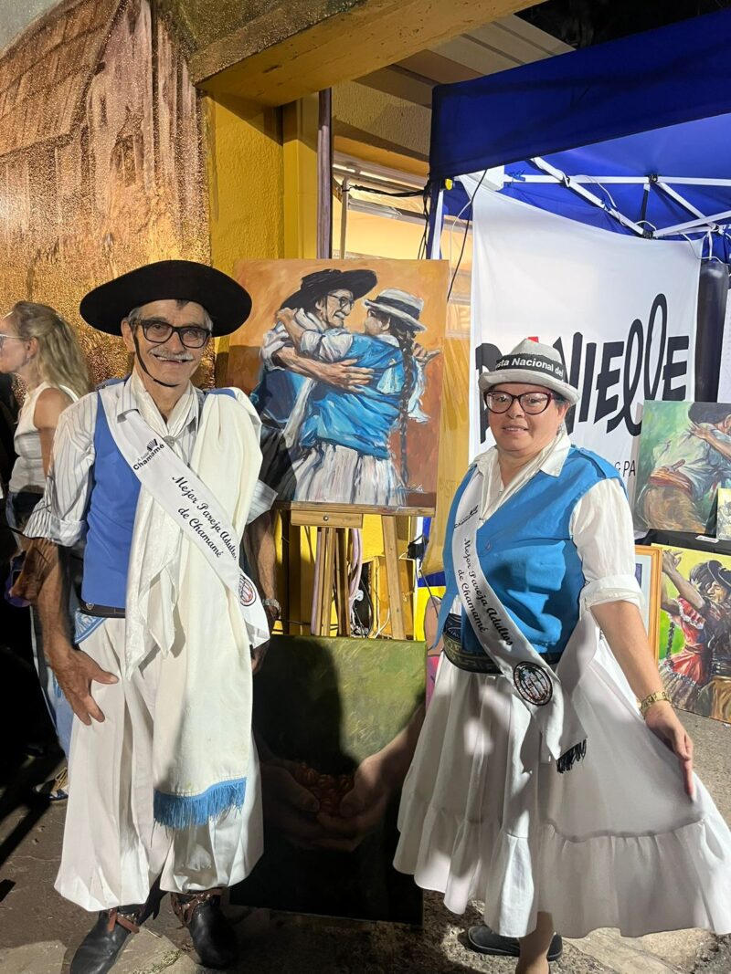 Entre las escenas que los marcaron aparecieron también rostros concretos. Una pareja de bailarines habituales del festival, Luis y Tere, se convirtió en protagonista de una de las pinturas. Su presencia constante y su cercanía con los artistas despertaron el deseo de rendirles un homenaje. “Todas las noches se acercaban, compartían. Llegó un momento en que sentí que se merecían estar en una obra”, relató García.