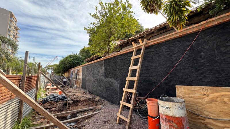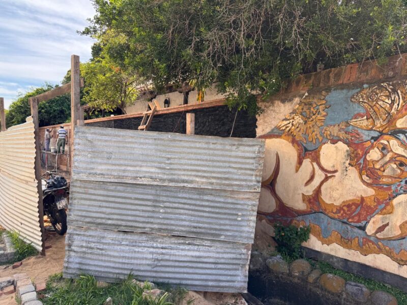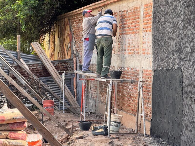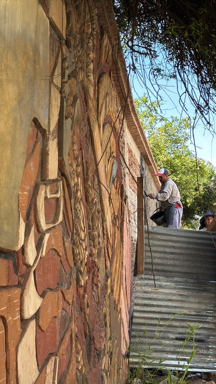 Estuvo caído nueve meses tras las fuerte ráfagas de viento y la intensa lluvia que azotó a la ciudad de Corrientes y ahora está en proceso de reparación con la técnica de esgrafiado: están haciendo revoques al mural a partir de capas de colores, comenzando con el negro.