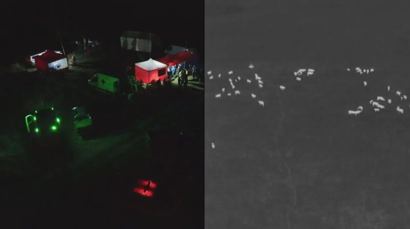 Al igual que la noche del domingo, se utilizan drones equipados con cámaras térmicas para detectar movimiento en la oscuridad, haciendo más fácil la tarea de búsqueda durante la noche.