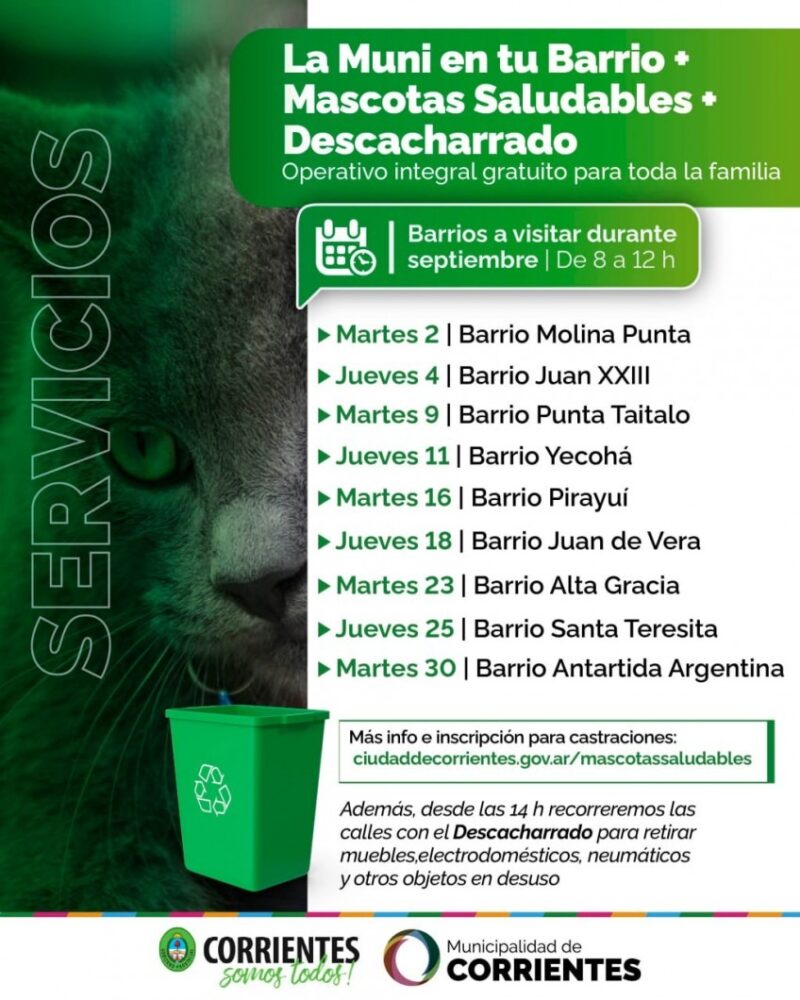 En cada operativo, La Muni en tu Barrio estará acompañado del programa Mascotas Saludables, que promueve la tenencia responsable de los animales domésticos, acercando atención veterinaria gratuita, vacunación antirrábica, desparasitaciones y esterilizaciones (castraciones). Este último servicio debe requerirse con antelación a través del turnero web (https://ciudaddecorrientes.gov.ar/mascotassaludables), por contar con un cupo limitado por cada operativo.