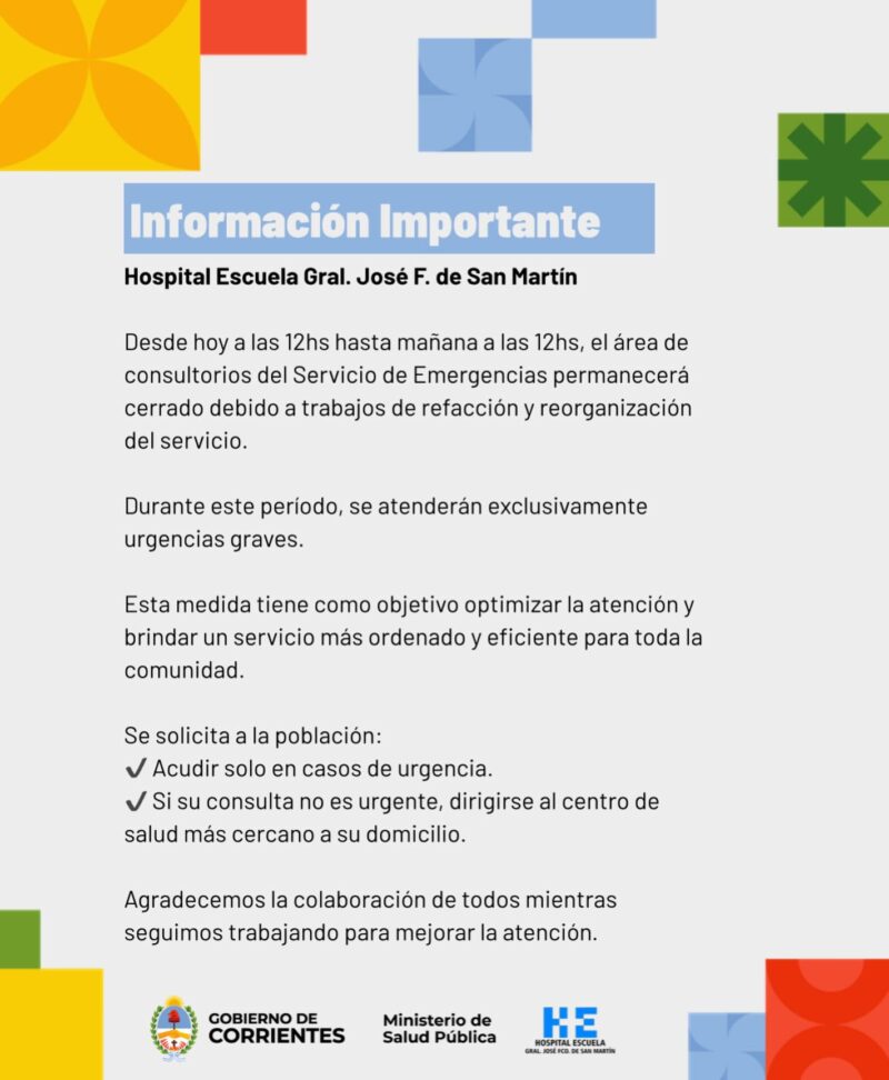 El centro de salud de la capital correntina informó que el área de consultorios del Servicio de Emergencias permanecerá cerrada desde este mediodía hasta mañana para optimizar las instalaciones.