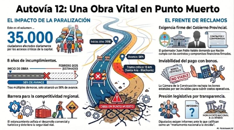 La pausa en la ejecución de obras de infraestructura de la Autovía 12 es motivo de un creciente malestar en la provincia de Corrientes, producto del freno de la obra pública nacional, lo que consiguió transformar lo que debía ser una solución vial en un foco de conflicto político y social. Es así que la paralización de la Autovía 12 ya no sólo representa una demora técnica, sino que se consolidó como la máxima prioridad en la agenda de reclamos del Gobierno provincial frente a la Nación.