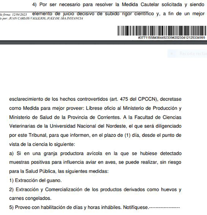 En el comunicado emitido ayer, la Justicia solicita en término de un día información «desde el punto de vista de la ciencia» sobre si en una granja avícola «en la que se hubiese detectado muestras positivas para influencia aviar en aves», se puede realizar sin riesgo para la salud la extracción de guano, y extracción y comercialización de derivados como huevos y carne congelada.