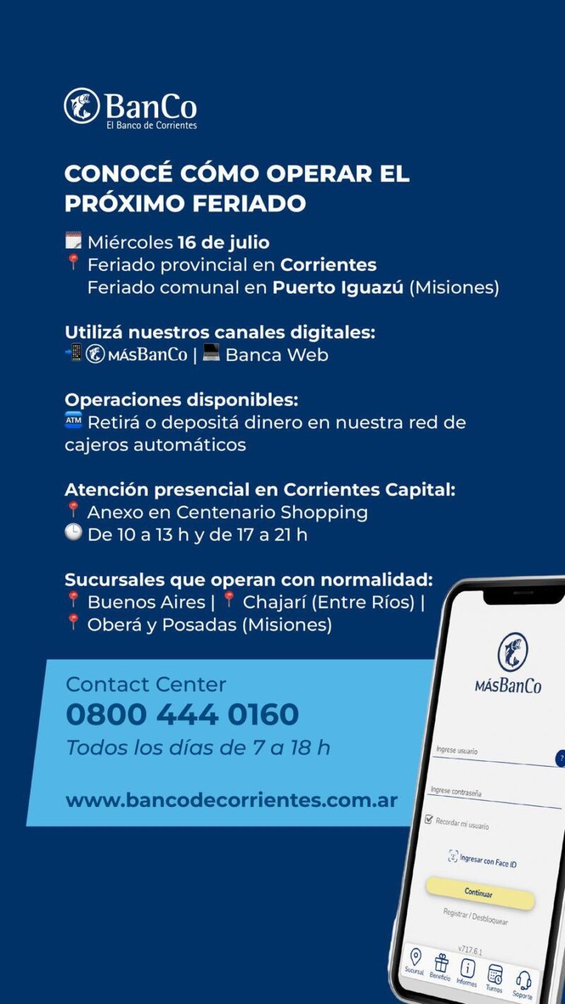 El Banco de Corrientes informa que, durante el feriado provincial del 16 de julio, se podrán concretar con normalidad todas las operaciones de pagos, transferencias, consulta de saldos, constitución de plazos fijos, realizadas desde sus canales digitales: la aplicación Más BanCo y la Banca Web.