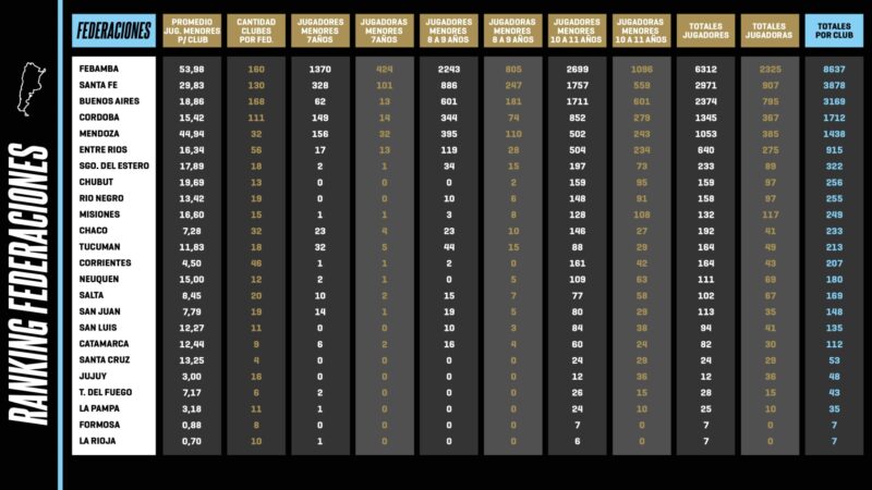 En cantidad de jugadores de ambas ramas también lideran esas cuatro regiones, pero en diferente orden. Febamba es la que más niñas y niños basquetbolistas aporta con 8.637 seguida de Santa Fe con 3.878. Buenos Aires tiene 3.169 jugadores registrados y Córdoba, 1.712.