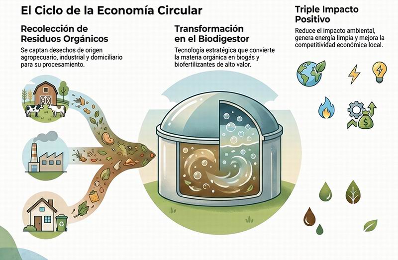 En el documento técnico se define a los biodigestores como una tecnología estratégica y accesible para transformar residuos orgánicos de origen agropecuario, industrial y domiciliario en biogás y biofertilizantes.