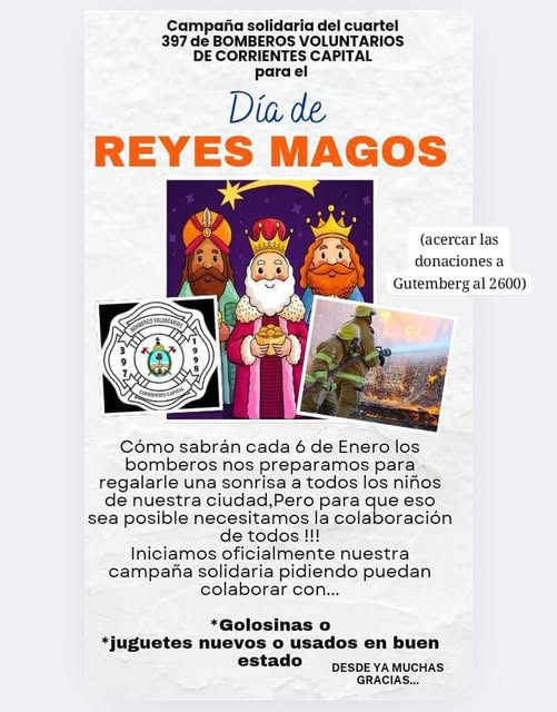 Como cada año, los integrantes del cuerpo de Bomberos Voluntarios de Corrientes Capital se transforman en ayudantes de los Reyes Magos. A través de sus redes sociales, la institución anunció el lanzamiento oficial de su campaña solidaria bajo el lema de «regalarle una sonrisa a todos los niños de nuestra ciudad».