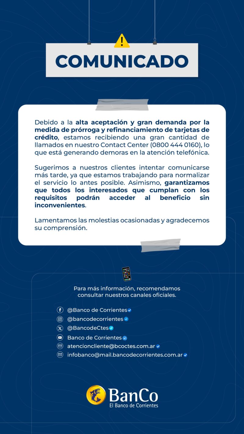 Desde el Banco de Corrientes emitieron un comunicado debido a la alta aceptación y gran demanda por la medida de prórroga y refinanciamiento de tarjetas de crédito.
