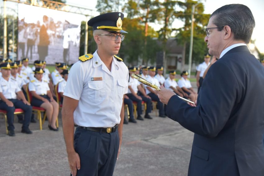 En su mensaje a los egresados, el vicegobernador expresó: «Les pido que piensen en el día que ingresaron a esta institución como cadetes de primer año. Más allá de la motivación de cada uno, no tengo ninguna duda de que si han llegado hasta acá es porque la vocación policial es lo que ha estado por delante de cualquier otro espíritu. Ustedes saben perfectamente que no han sido cuatro años sencillos, sobre todo el comienzo, cuando tienen que pasar por todas las exigencias para poder encaminarse como cadetes de primer año. Hoy finaliza una etapa pero se inicia otra. Hoy han recibido su despacho y el sable y quiero tomar las palabras del párroco, que al hacer referencia a ese símbolo expresaba lo que significa por sobre todas las cosas: que la sociedad deposita en sus manos autoridad pero deposita y espera también una enorme responsabilidad en el ejercicio de esa autoridad, como dijera el señor Jefe de Policía, fundada en la Constitución y  las leyes».