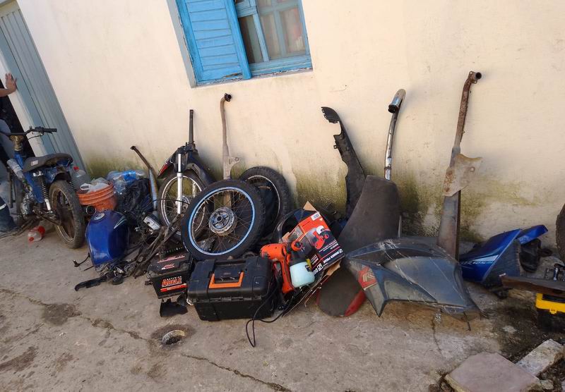 En total incautaron: una motocicleta Titan CG 150, otra Zanella ZB 110, otro rodado sin plásticos y con una rueda en mal estado, un cuadro completo de bicicleta -marca SLP-, otra motocicleta Dax 90cc Zanella, una Guerrero 110cc, y motopartes varias. «También gran cantidad de herramientas, ruedas de diferentes cilindradas, una amoladora, una batería marca Arcle, una pistola para pintar, un casco, un tanque de combustible de YBR, dos cortadoras de cerámico, y cuatro teléfonos», completaron las fuentes del caso.