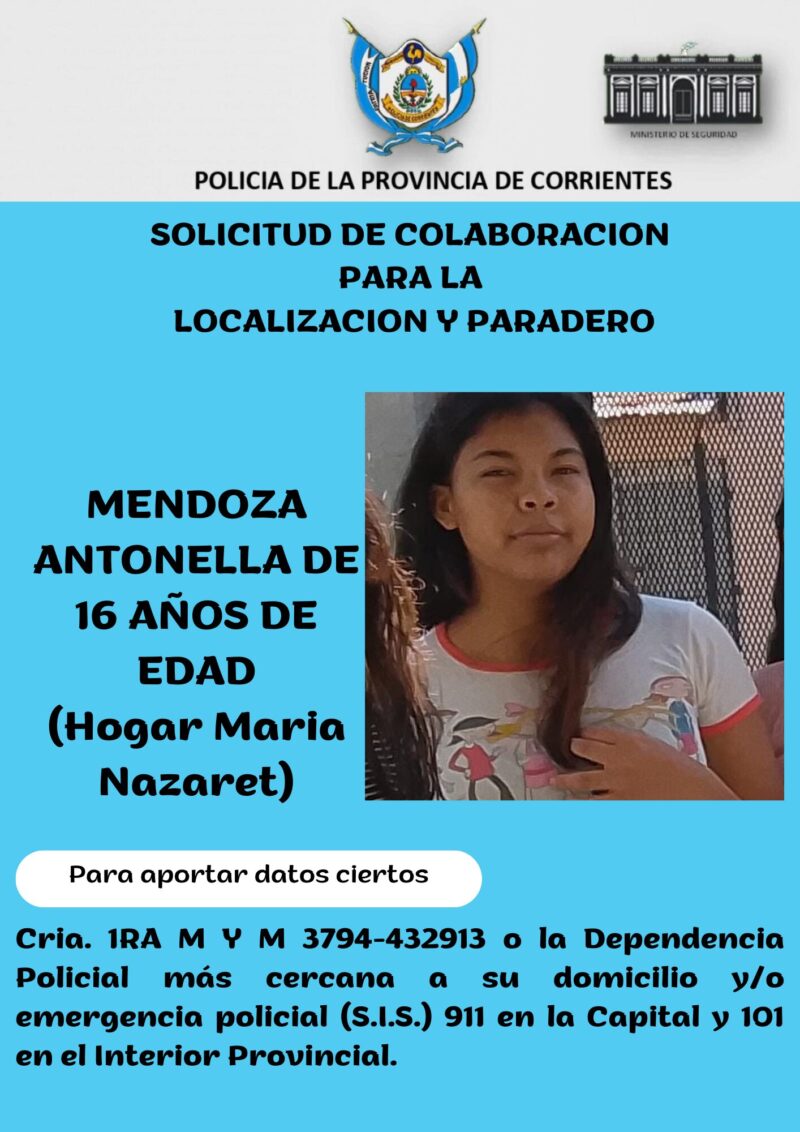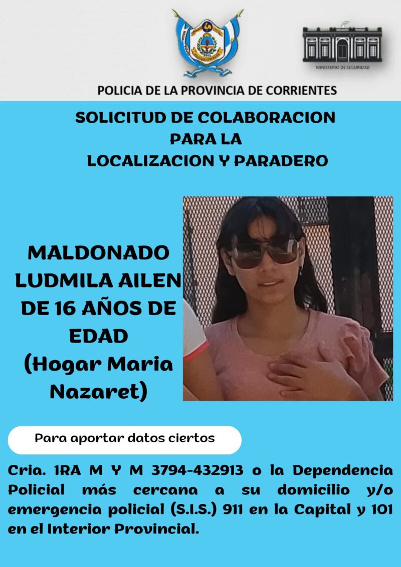 La Comisaría Primera de la Mujer y el Menor de la ciudad de Corrientes emitió un pedido de colaboración para dar con el paradero de dos adolescentes que se ausentaron del Hogar María Nazareth en las últimas horas. Se trata de Ludmila Ailén Maldonado y Antonella Mendoza, ambas de 16 años.