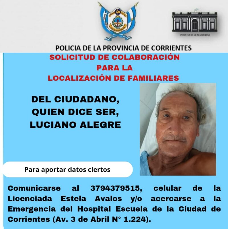 Ante esta situación, desde el Hospital Escuela pidieron a quienes puedan aportar información sobre familiares o personas cercanas que se acerquen a la institución, ubicada en avenida 3 de Abril 1224, en la ciudad de Corrientes.