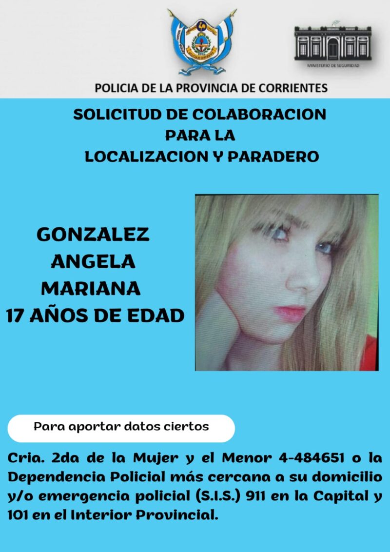 La Policía de Corrientes activó la búsqueda de Ángela Mariana González, de tan solo 17 años de edad, quien se encuentra desaparecida de su hogar en Capital, desde la tarde de ayer. La nueva y urgente solicitud de colaboración se emitió hoy, sábado 27 de septiembre, desde la Comisaría Segunda de la Mujer y el Menor.