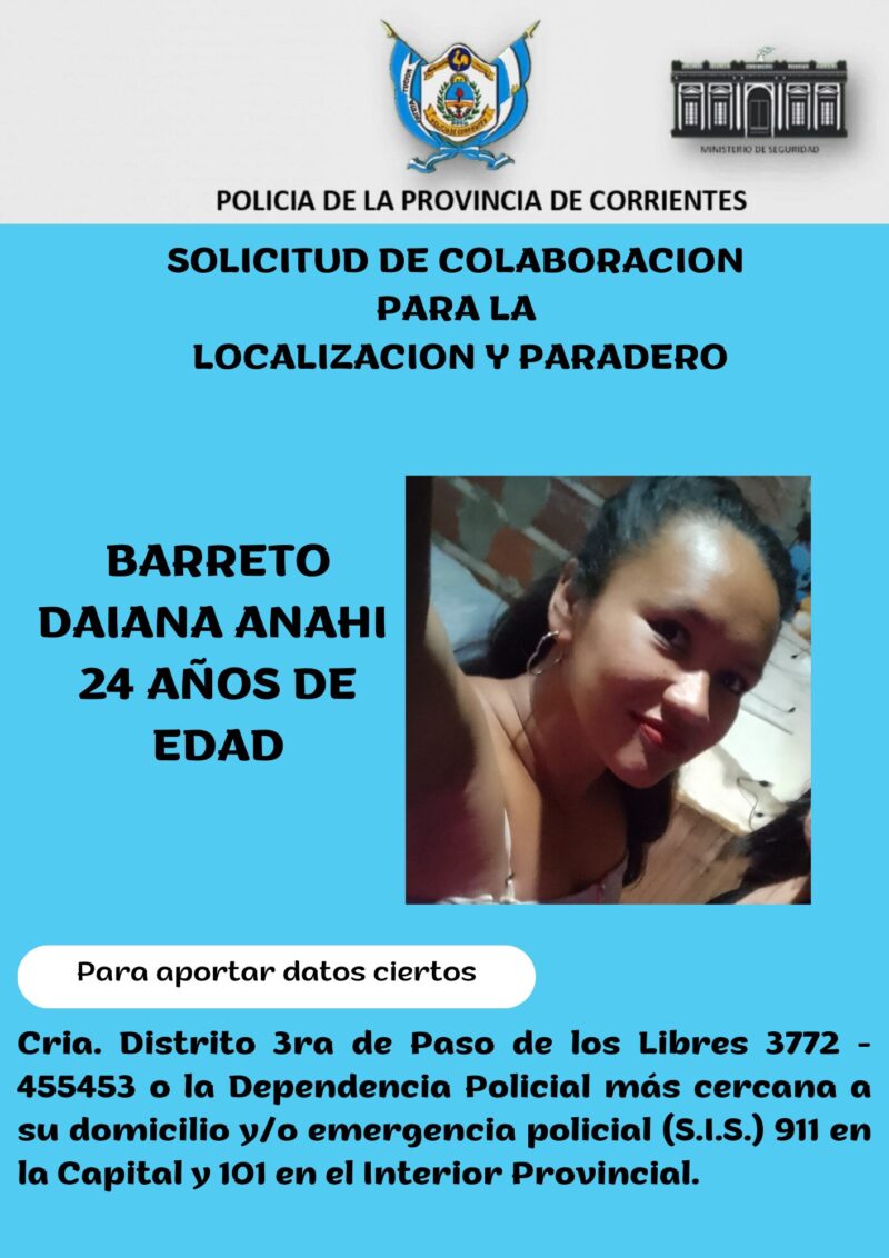 La Policía de Corrientes, emitió una solicitud de colaboración para dar con el paradero de Daiana Anahí Barreto, una mujer de 24 años que se encuentra desaparecida en Paso de los Libres.