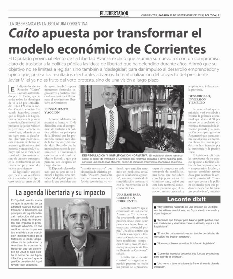 El diputado electo, Ricardo «Caíto» Leconte, entrevistado por El Radar, que se emite todos los domingos de 11 a 13 por InfoDRadio 106.3 FM con la conducción del periodista Facundo Sagardoy, destacó que su llegada a la Legislatura representa la primera consolidación territorial del proyecto de Javier Milei en la provincia.
