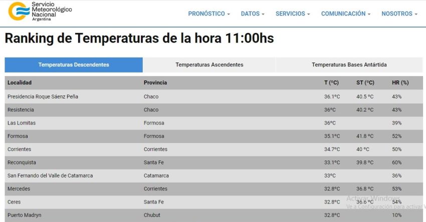 La tendencia continúa, ya que este lunes a las 11, la sensación térmica alcanzó los 40 grados en la Capital, mientras que la temperatura marcó 34 grados. Así, se ubica entre las cinco ciudades más calurosas del país. Lideran el ranking ésta mañana, Presidencia Roque Sáenz Peña y Resistencia, Chaco, y las ciudades formoseñas de Las Lomitas y Formosa Capital.