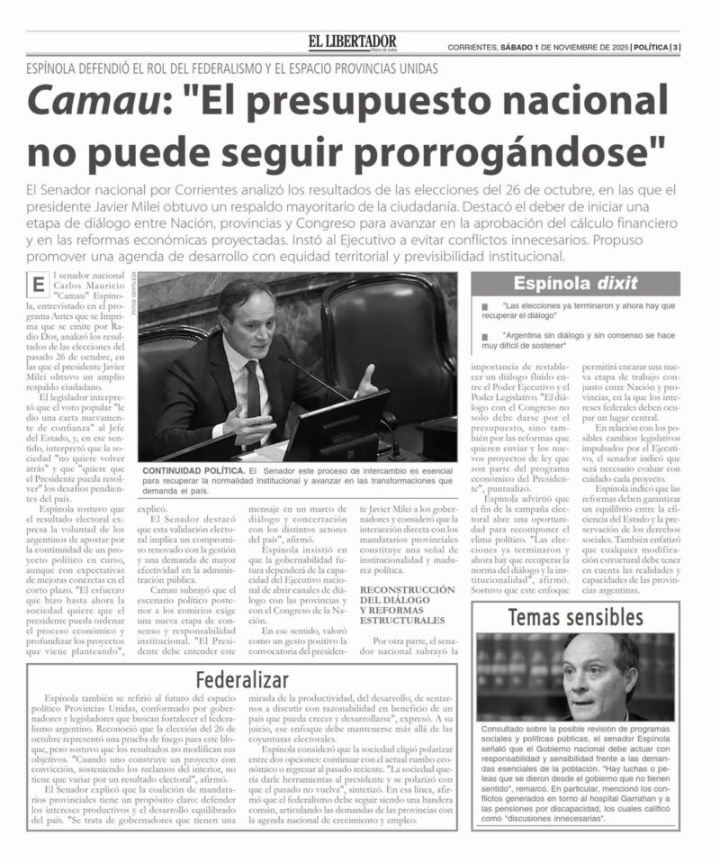 Espínola advirtió que el fin de la campaña electoral abre una oportunidad para recomponer el clima político. «Las elecciones ya terminaron y ahora hay que recuperar la norma del diálogo y la institucionalidad», afirmó. Sostuvo que este enfoque permitirá encarar una nueva etapa de trabajo conjunto entre Nación y provincias, en la que los intereses federales deben ocupar un lugar central.