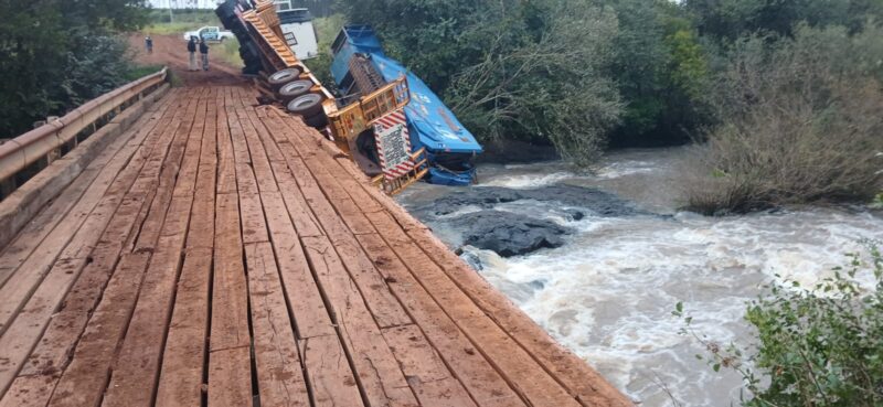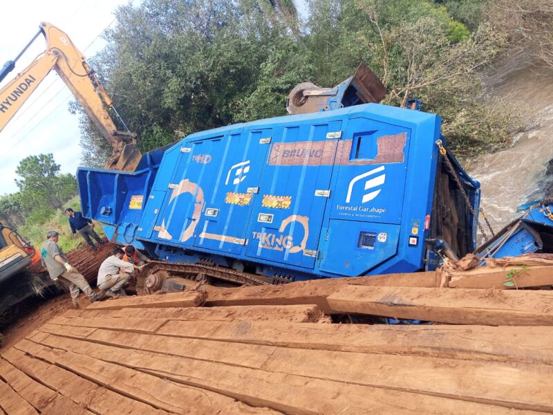 El hecho ocurrió sobre un camino vecinal poco transitado que conecta la Ruta Provincial 94 con la Ruta 68, en el noreste correntino, en la jornada del lunes. Las imágenes se conocieron en las últimas horas y dejan en evidencia que el puente de madera que cruza el arroyo Garaví, no estaba preparado para soportar el peso del camión que además transportaba maquinaria forestal.