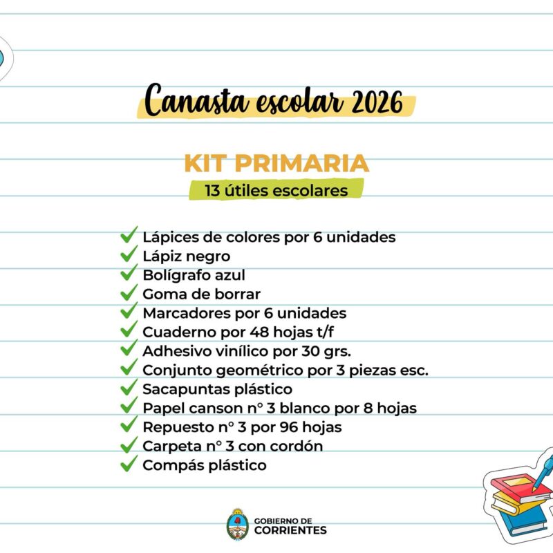 A partir de hoy y hasta el 31 de marzo, se encuentra disponible la Canasta Escolar 2026 en la provincia, la iniciativa ofrece kits escolares para los tres niveles educativos a un precio unificado de $12.999. El Gobierno provincial ratificó la vigencia de esta nueva edición, destacando que se mantendrán los precios de 2025 para los niveles primario y secundario. Esta medida representa un ahorro aproximado del 28 por ciento respecto a los precios de lista del mercado, beneficio que se potencia al sumarse los descuentos adicionales que se instrumentan a través del Banco de Corrientes.